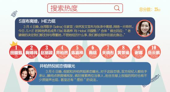上周突发事件有点多,明星吸毒、意外烧伤、恋情曝光、还有离婚公告!3月4日晚,台湾歌手Selina(任家萱)突然发文宣布与张承中离婚,网络一片哗然。隔天,S.H.E的其他两名成员Ella(陈嘉桦)与Hebe(田馥甄) “合体”做出回应:“老婆做的决定我们都支持与尊重她,不管她经历什么事,我们都会陪伴在彼此身边。”如此姐妹情深简直让人泪流满面,更有网友总结了Hebe告白Selina的六十句话,让人感动不已。而与此事件相关,Hebe、Ella亦纷纷登上热搜榜,其中Hebe空降热搜分榜第一。