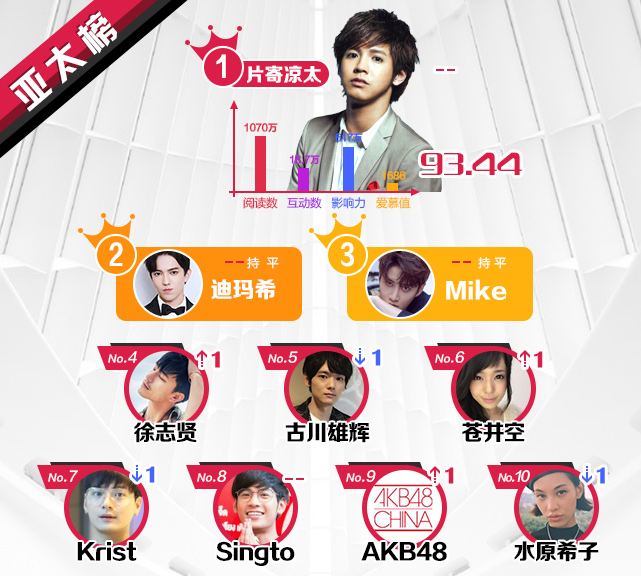 亚太榜:片寄凉太蝉联第一 迪玛希第二