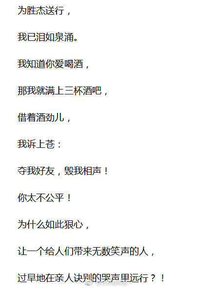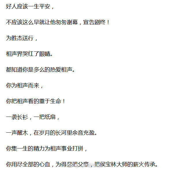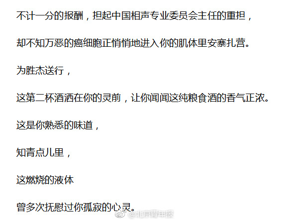 姜昆在长诗中透露,师胜杰“用尽全部的心血,为的是把父辈,把侯宝林大师的薪火传承。不计一分的报酬,担起中国相声专业委员会主任的重担,却不知万恶的癌细胞正悄悄地进入你的肌体里安寨扎营。”