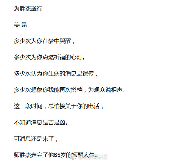 姜昆在诗中说,师胜杰是自己相声舞台上的第一个搭档。他们第一次合作,表演了《林海红鹰》。姜昆表示,师胜杰病重这一段时间,总怕接关于师胜杰的电话,“多少次为你在梦中哭醒,多少次为你点燃祈福的心灯,多少次认为你生病的消息是误传”,但最终,师胜杰病逝的消息还是传来了。