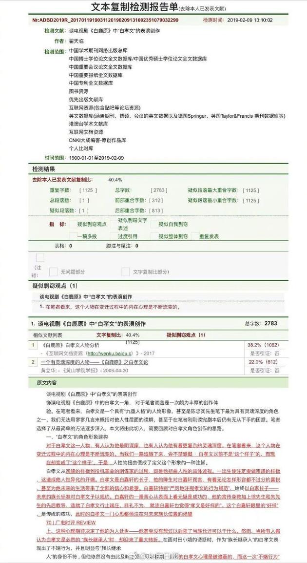 @PITD亚洲虐待博士组织在微博放出了一张知网查重检测单。结果有点尴尬——除去本人已发表文献重复比40.4%。