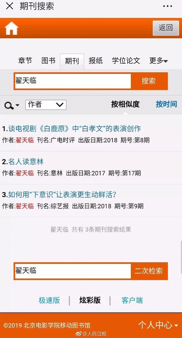而@ PITD亚洲虐待博士组织 的粉丝们在整个中文知识库中一顿搜刮,也只找到了翟博士署名的两篇文章,其中一篇发在《综艺报》上,实在算不上期刊论文。唯一一篇勉强可能算得上的,是翟博士发表在《广电时评》上的《谈电视剧<白鹿原>中“白孝文”的表演创作》,不到3000字。