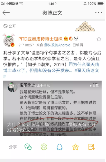 微博账号@PITD亚洲虐待博士组织 在大年初三转发了一个知乎问答:为什么翟天临博士毕业了,但是却没有公开发表的论文。
