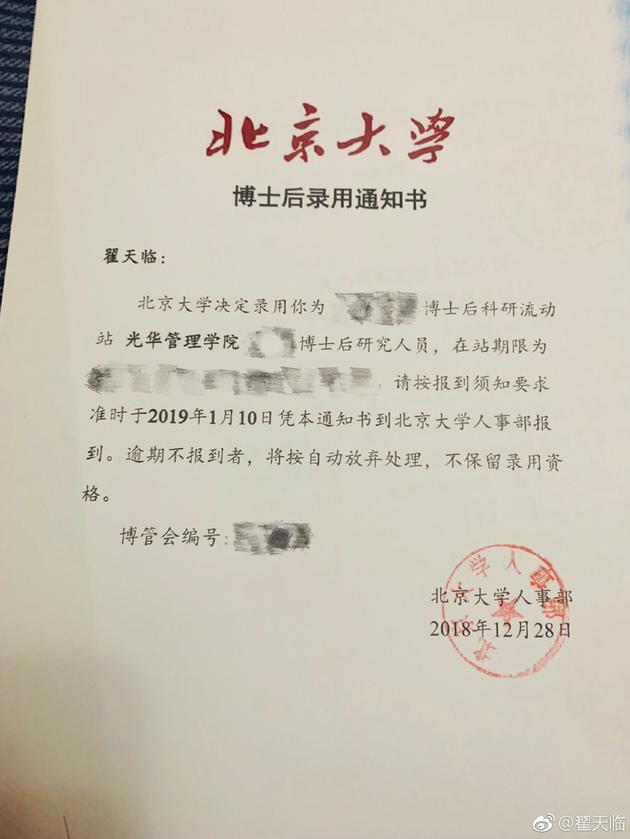 当然,这个疑惑也很容易破解。学位是北电给的,通知书是北大发的。只需要他们出来走两步,解释一下翟博士的特殊之处,或许大家还是能够充分理解。