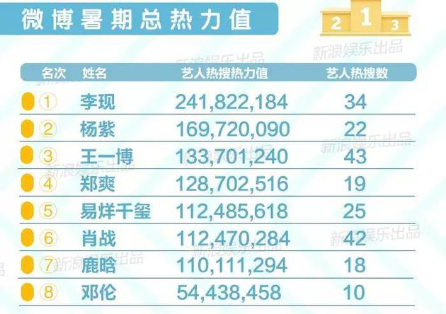 娱理工作室将统计范围定在6月16日至8月15日,梳理了微博热搜热力值排行、微信指数以及百度指数三大数据维度,每类数据选出数值最高的8位艺人,且入选的前提是他们在这个暑期有作品,最终,得出五位暑期档“顶级流量”:李现、杨紫、王一博、肖战、郑爽。