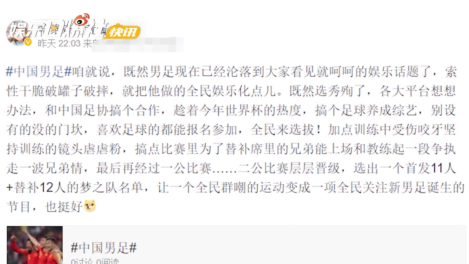 摘要: 16日,原际画创始人黄锐发文谈国足表示希望能做一个足球养成综艺,喜欢足球的都可以报名参加,全民进行选拔。