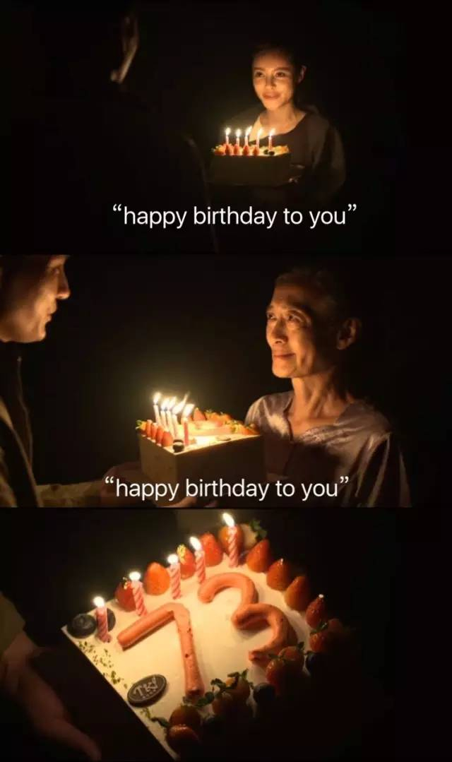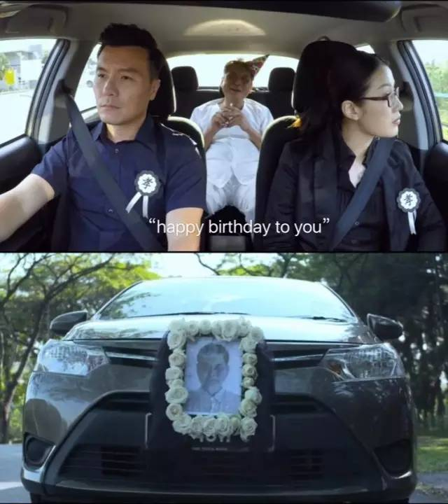 生日当天,遗照、灵车、丧服、胸前佩戴的“孝”字胸章,还有车里唱着生日歌的老父亲,这副诡异的画面看得人五味陈杂……