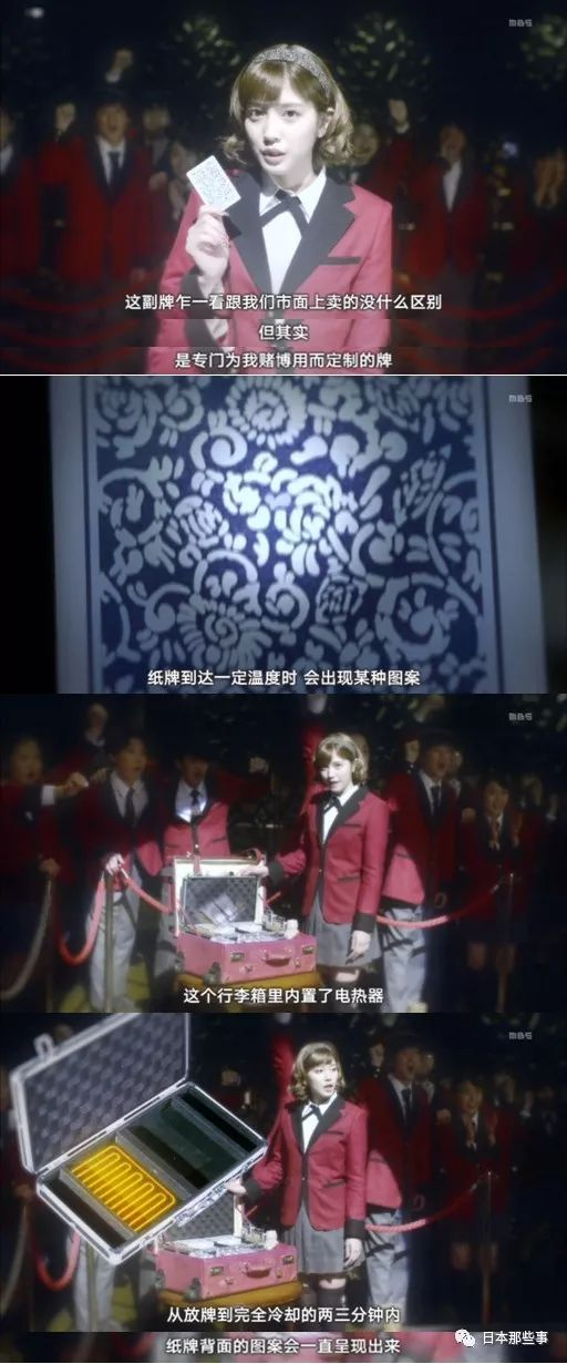 剧中介绍了很多赌博游戏,比如早乙女芽亚里发起的“投票猜拳”,全班30名同学各自在卡片上画出石头、剪刀、布,将卡片在赌博者看不到的情况下投入箱子,该环节就叫“投票”,赌博二人从箱中抽出3张卡片,选出1张进行“猜拳”。