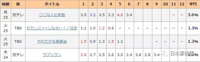 一般来说,日本晚上十一点之后播出的电视剧集都属于“深夜剧”,除了朝日台金23档的剧集收视会高一些之外,大部分的深夜剧收视都在1.5-3.5之间。