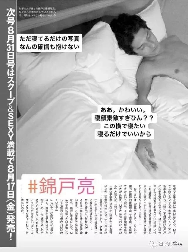 今天早上《Friday》在最新号中曝光了锦户亮的单人床照,与关西素人人妻的秘密约会也被《Friday》作为重点写出了一篇小作文……