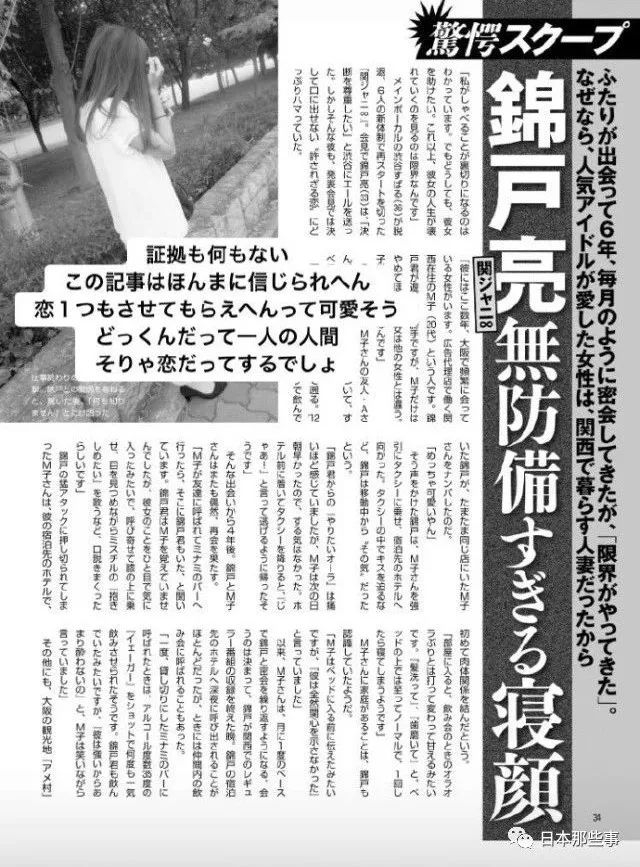 “最初得知这个消息完全不敢相信,普普通通在广告行业认真工作的M子怎么可能会和人气偶像有这种关系……但是当M子拿出在酒店中拍摄的锦户亮的睡颜照片时,我告诉M子一定要断绝这段关系,M子虽然明白其中的种种不道德,但却依旧说着‘我是真的很喜欢他……‘”