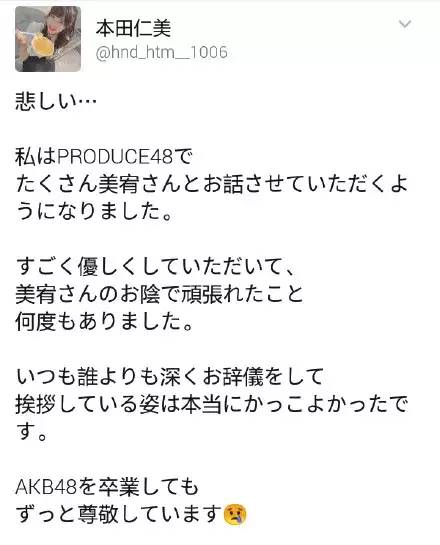 在《PRODUCE 48》中实现出道的本田仁美也在推特上回应了竹内美宥。