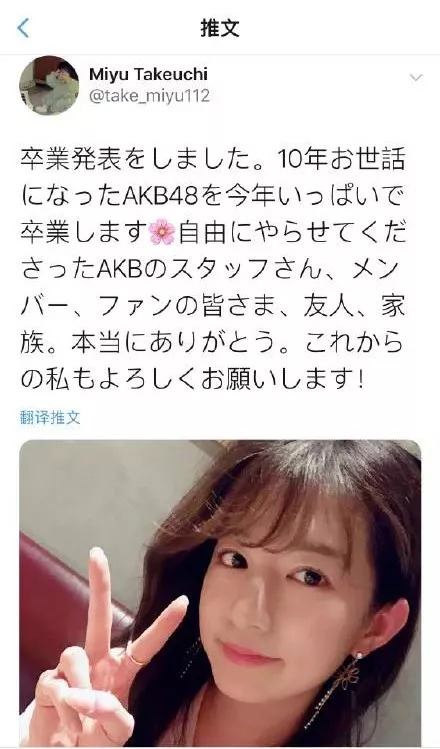 竹内美宥也在个人推特上向粉丝们正式报告了自己将毕业的消息:决定要毕业了。从一直以来备受照顾的AKB48中毕业了,感谢给予我自由发展的staff们、队员们、粉丝们、朋友们以及家人们,真的很感谢大家,以后也拜托大家继续支持我!