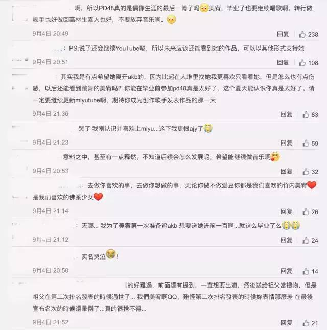 粉丝们也都表示“明年总选举一定不会是在圈外了”“我们不会辜负竹内美宥的梦想”,而正当粉丝们摩拳擦掌准备为竹内美宥做好应援的同时,竹内美宥却在《PRODUCE 48》结束后的短短一周就宣布了自己将要毕业的消息。