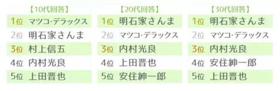 这是明石家秋刀鱼第三次登上这个排行榜首位。虽然过去屡次传出要隐退的传闻,作为搞笑怪兽的人气并没有衰弱,63岁的他在去年12月还主持了9个年末特别节目。