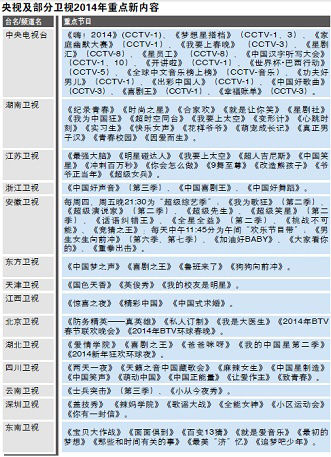 2014电视荧屏,季播真人秀热度继续。除了上述三大热门音乐节目,湖南卫视宣布明年将推出周末“真人秀”板块;江苏卫视[微博]计划连推三档全新真人秀;天津卫视表示将重点打造真人秀节目;贵州卫视明年的栏目设置中,真人秀也占据重要板块,将推出《唱出爱火花(第二季)》《完美邂逅(升级版)》《武林争霸》《拍案叫角》等大型季播节目;深圳卫视将推出八档大型季播节目,比如周六晚9:20节目带的《超人大赛》《歌谣大战》《全能女神》《百万秒智力竞赛》等。
