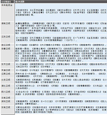 央视拥有以CCTV-1黄金剧场为核心,包含CCTV-8、CCTV-4、CCTV-11在内的四个频道、十四档剧场的电视剧播出平台。11月6日,央视一套黄金档首度与湖南卫视[微博]联播《咱们结婚吧》,尝试了一种新的播出方式。接下来,央视重点剧目还有《北平无战事》《非诚勿扰》[微博]《红高粱》《新京华烟云》《大河儿女》《父母爱情》《好大一个家》《原乡》《大江东去》《一代枭雄》等。