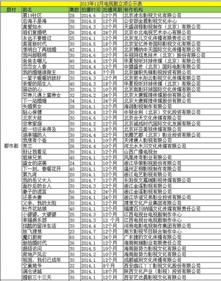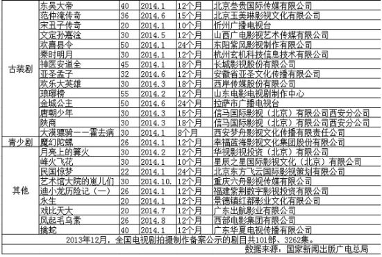 2013年12月,全国电视剧拍摄制作备案申报公示的剧目共101部、3262集。