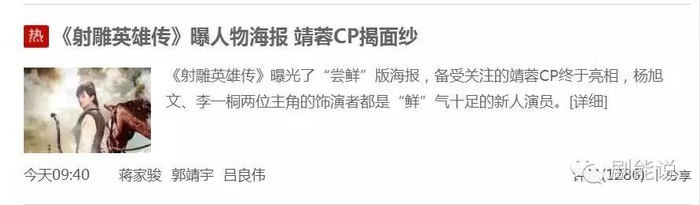 是的,新版《射雕英雄传》曝光人物海报了,黄蓉郭靖杨康穆念慈正式曝光咯。或许是因为我是金庸书迷的缘故吧,看到新版《射雕》公布演员,就想来跟你们一起八一八个角色。