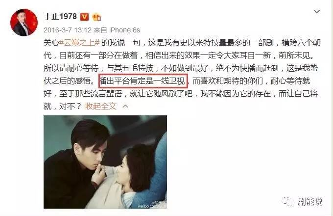 但原本说2016年会播出的《云巅之上》直到现在才播,而且改成了网播,于正给出了“投资方嫌价格低,非拿回去自己发行”的理由。