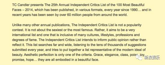 答:美国著名电影网站TC Candle主办,从1990年开始,至今已有27年的历史了。榜单以世界各国的女演员、歌手、模特为对象,以“面孔美学完成度”为标准进行评判。
