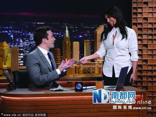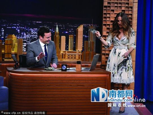 福伦的首秀星光璀璨,赚足了面子!歌后Lady Gaga、玛利亚·凯莉、喜剧演员塞斯·罗根、影星罗伯特·德尼罗、拳击明星迈克·泰森等各界大牌交替出场,给新科主持福伦塞上小费,场面滑稽,明星们仅现身一刹那,就转身离开,专程为福伦首秀造势。天后玛利亚·凯莉直接从胸衣里掏出美元,扔在福伦面前;LadyG aga黑纱透视装亮相,动作柔美,送钱送香吻;而搞笑名嘴史蒂芬·科拜尔干脆提来一桶金币,愣是浇在了福伦的头上,上演“金币浴”。