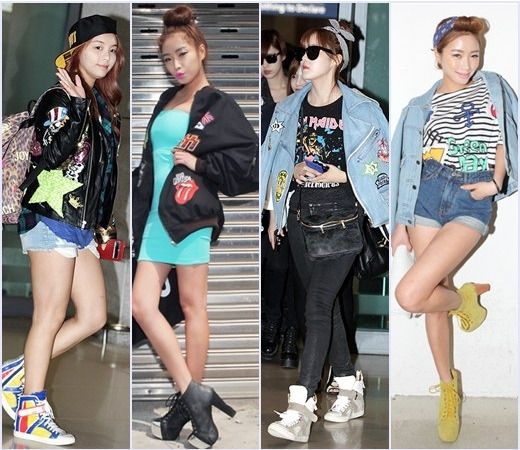 孝敏(右二)新浪娱乐讯 从女团4minute的舞台装为首,偶像女星们的机场时装朋克范儿十足,个个都以时尚街头风尽显自由奔放魅力。
