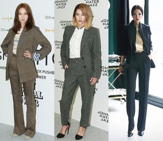 时尚界达人孔孝真在出席某品牌活动时,一身卡其色职业套装内搭白色透视衫,尽显干练性感魅力。After School前成员嘉熙选择了一款灰色系职业套装,以白色衬衣作为内搭单品,展现出干练利落的古典气质。