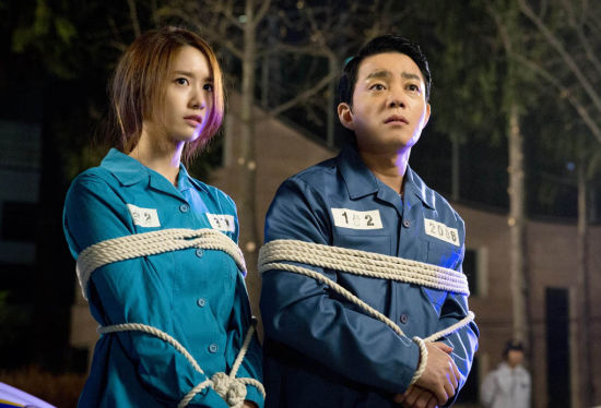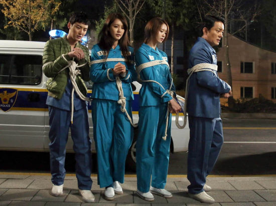 《总理和我》剧照新浪娱乐讯 韩国KBS 2TV新月火剧(周一周二播出的剧集)《总理和我》剧组今日(12月6日)公开了李凡秀、少女时代成员允儿、蔡贞安、尹施允[微博]穿囚服被绑的剧照。