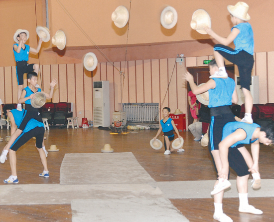 排练场上,杂技团的近30名学员现场向观众展示杂技的基本功,这些小演员中年龄最小的不过五岁,但是看他们下腰、踢腿、在椅子上直立都是有板有眼,甚至在表演翻跟头的时候,两个小女孩互相抱腰后翻,动作自然宛如同一个人。