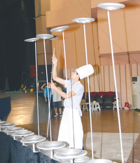 表演环节,一名16岁青年演员表演了传统节目,这位“大厨”将大勺、刀子和土豆转了起来并最后用刀子叉中土豆,更把锅子当成篮球在手指上旋转。但令人啧啧称奇的还是转盘子,27个盘子被分为3排,分别在桌面、托盘和杆子上旋转,当三排盘子一起旋转起来时,排练场内掌声久久不停。