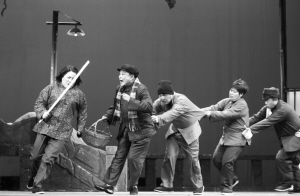 和以往的滑稽戏布景不同,《顾家姆妈》没有用传统的水墨画背景,主场景紫衣巷的粉墙黛瓦都是一块一块拼在一起的,线条很有“贝聿铭”的风格。