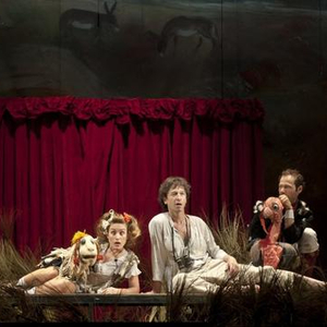 以色列舞台艺术家在剧场还原了一片杂草丛生的沼泽地,地平线底部铺设环形轨道作为人物出场情景变换的动态装置,借助动与静的对立,营造出时间的生生不息,并直接促成舞台行动紧锣密鼓地推进。舞台的形象描绘与意象提炼并行不悖,扎根现实又超越现实。