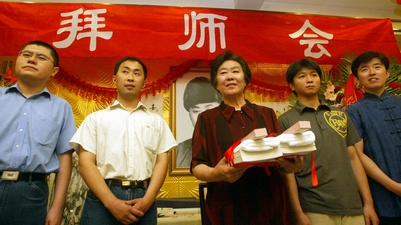 连丽如是我国著名评书表演艺术家,其父是评书大师、人称“净街王”的连阔如。按老规矩,连丽如端坐太师椅,吴迪、贾林、祝兆良、梁彦四名弟子跪地三叩首,正式拜入连派门下,传承中华评书艺术。据说,身为美术教师的大弟子吴迪用评书方式讲授中国传统文化,在教育界影响很大。“他给四个班的同学讲课,不用麦克风大家照样听得见,因为他用的是传统评书的丹田气。”连先生说这话时很是得意。在现场,连丽如将扇子、醒木、手巾等“评书三宝”以及连阔如先生遗作《江湖丛谈》作为礼物送给众徒弟。这些宝贝中既有祖上珍传,也有师徒人情。她告诫弟子们,不懂人情就说不好书,懂多大的人情说多大的书。这话是连阔如先生传下来的教诲。