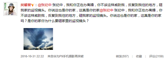 至此,樊馨蔓方对11月2日的故事讲述已经完成逻辑闭环,但整个离婚故事还不完整,让整个故事更加完整的,是10月31日,樊馨蔓深夜发出的曝光张纪中反复上门威胁,还砸坏了监视镜头,更控诉其曾隐藏转移婚内财产的微博:
