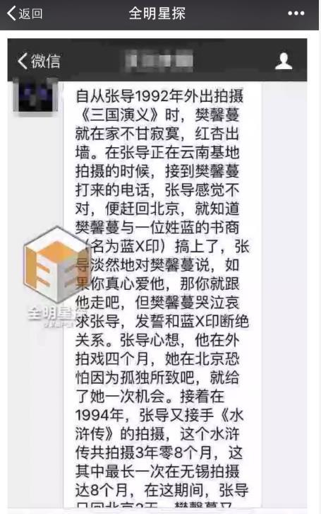 而在樊馨蔓和肖齐的出轨传闻之外,还有号称张纪中和樊馨蔓共同的一名好友曾向全明星探爆料称,樊馨蔓是“恶毒又不检点,曾出轨过五次的女人”。