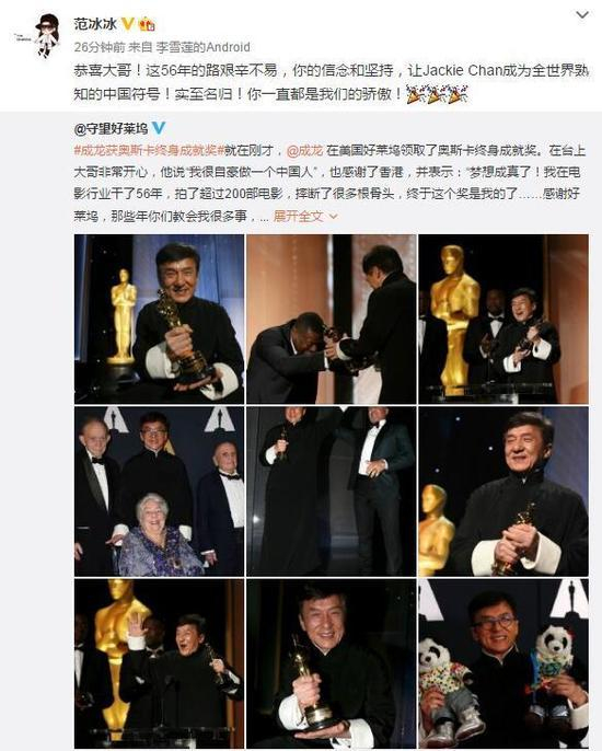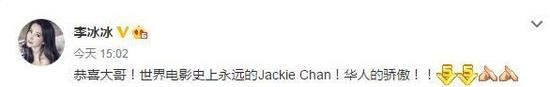 李冰冰写道“恭喜大哥!世界电影史上永远的Jackie Chan!华人的骄傲!!”