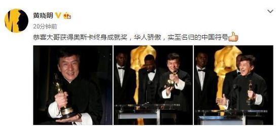 黄晓明写道“恭喜大哥获得奥斯卡终身成就奖,华人骄傲,实至名归的中国符号”。