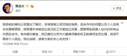 随后唐人发声明,提出蒋劲夫在未经协商的前提下单方面解约,并且解约的原因是第三方以高利益对蒋劲夫进行诱惑。