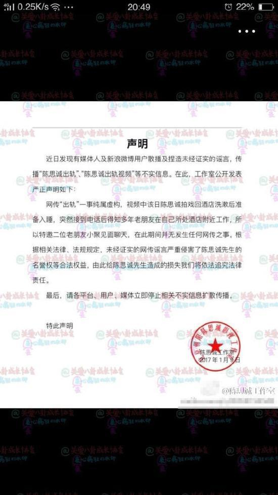 可是故事还在继续。当天晚上,一个新注册名为“陈思诚工作室”的微博,对出轨门一事发表了声明,称“陈思诚与多年未见的老友聚会”截至目前,并未有能证明该微博及该声明确实为陈思诚工作室所发。