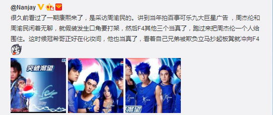 仔仔周渝民曾经分享过一件事,是说当时周杰伦陈冠希还有F4在一起拍广告,仔仔和杰伦闲得无聊假装起冲突,F4其他三个人立马就涌上来了。然后陈冠希看到自己的好基友周杰伦被欺负,也立刻抄起板凳就来了。
