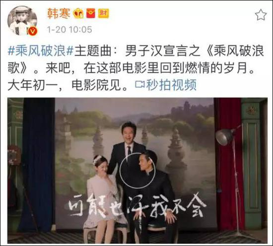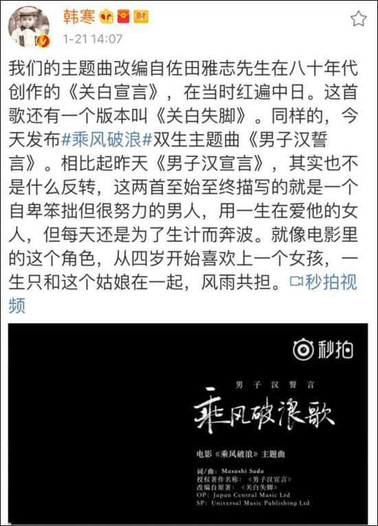 现在,回到事件本身。1月20日上午10点,韩寒微博发布电影《乘风破浪》的主题曲:男子汉宣言之《乘风破浪歌》。