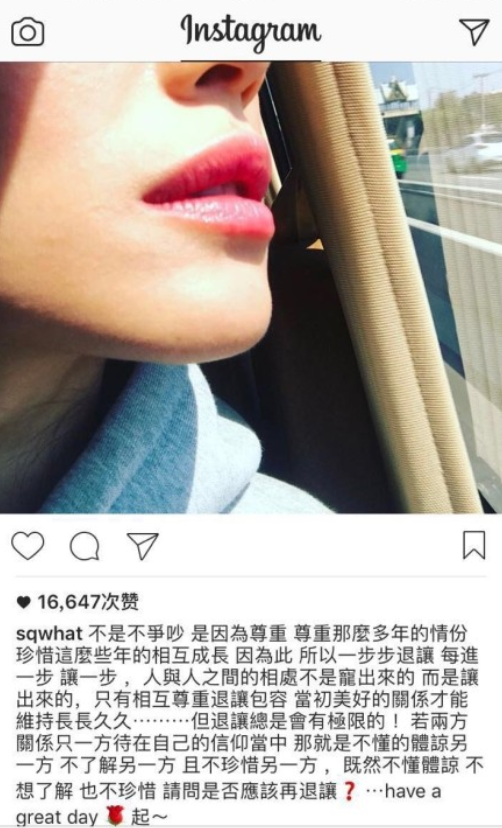 舒淇去年9月和冯德伦闪电结婚,屡次传出已经怀孕,但都没有正面回应。我们本以为,就像所有童话故事的结尾,公主和王子从此幸福地生活在一起。可是12日舒淇突然在Instagram上发布长文,文中提到:“尊重那么多年的情份…但退让总是会有极限的!”
