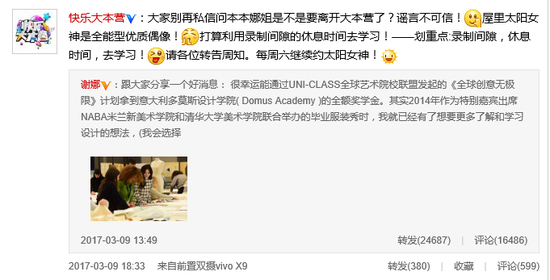 对此《快本》官微还特别回应称谢娜是打算利用录制间隙的休息时间去学习!