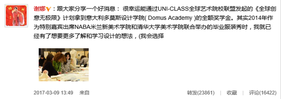 3月9日,谢娜在微博宣布将去意大利学习服装设计,她已经获得了意大利多莫斯设计学院( Domus Academy )的全额奖学金。