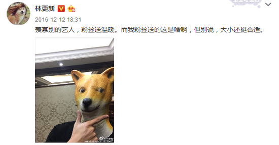 林更新的粉丝给他送狗头套。