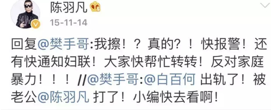 2015年网传白百何遭陈羽凡家暴,陈羽凡直接转了说他家暴的微博,调侃说快报警。