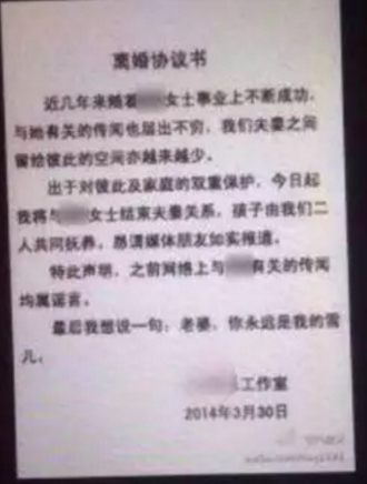网络曾流传一份离婚协议书,提到“你是我永远的雪儿”。羽凡马上在微博上回应子虚乌有,怒斥网友诽谤。