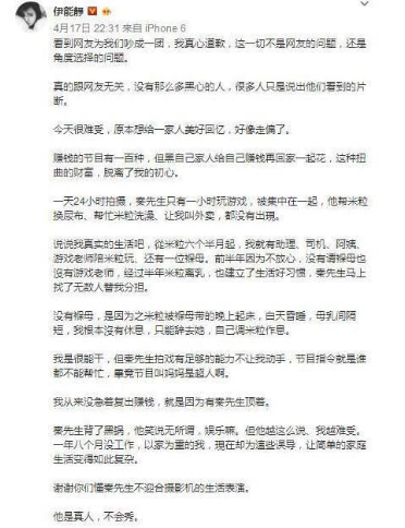可是伊能静秦昊婚后家庭生活的真相到底是什么?秦昊究竟是不是被节目“坑爹”?伊能静又为何要手撕网民和节目组,亲自下场护夫?