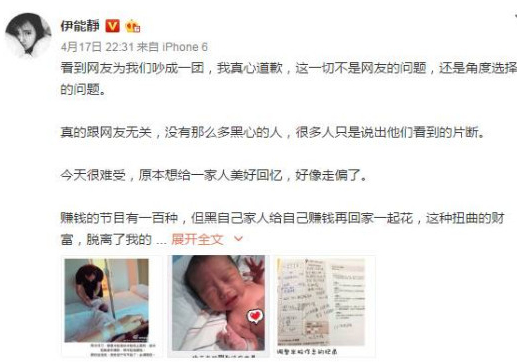 第二天凌晨,伊能静再次发长文对女儿道歉,称“米粒摔下来的视频至今不敢看,还是会哭”。